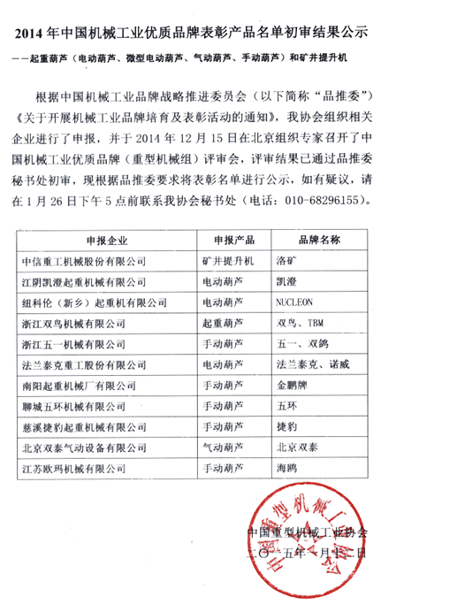 2014年中國機(jī)械工業(yè)優(yōu)質(zhì)品牌表彰產(chǎn)品名單初審結(jié)果公示